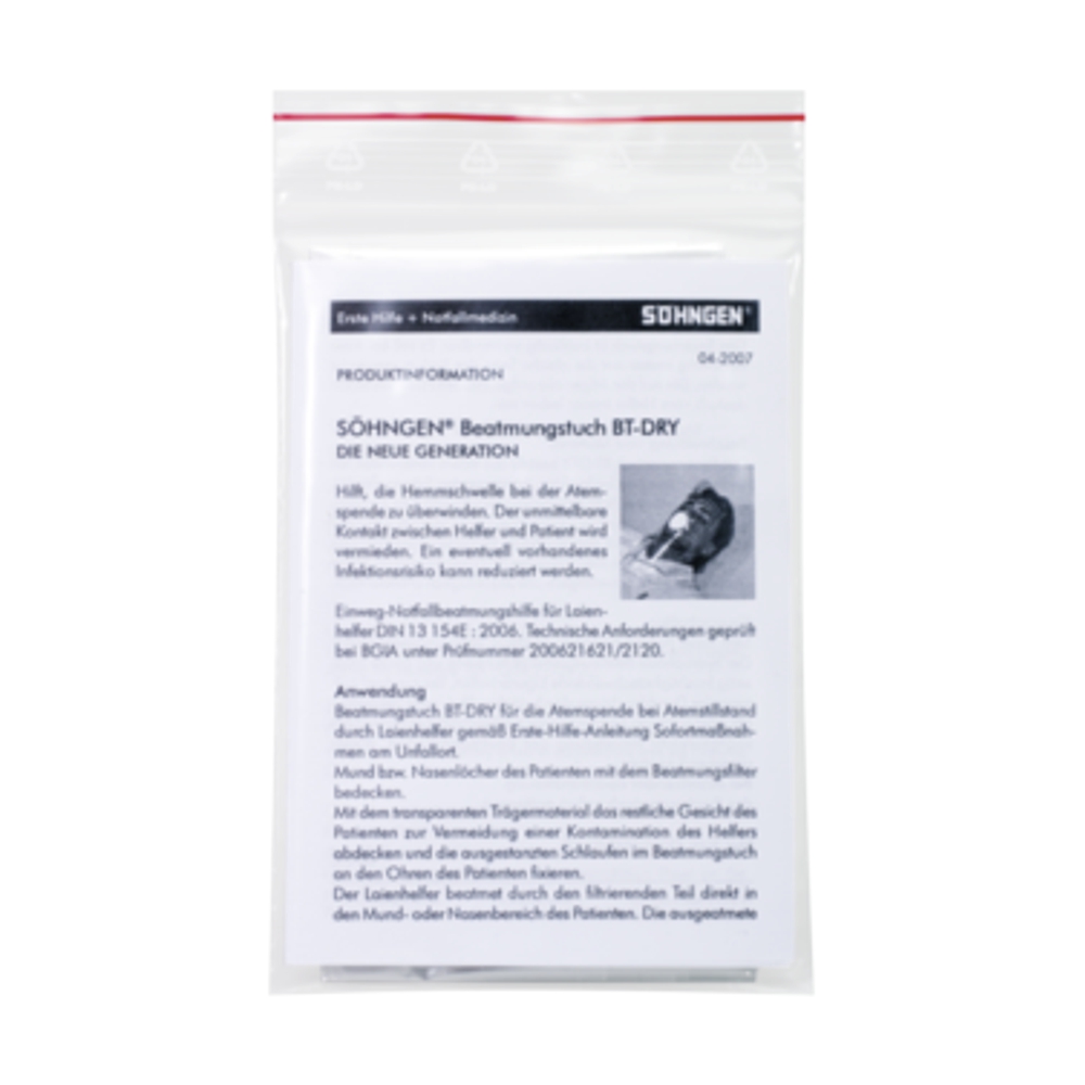 Diese universelle Beatmungshilfe reduziert das Kontaminationsrisiko und hilft die Hemmschwelle bei der Atemspende zu überwinden. Passt noch in jede Geldbörse und bietet guten Schutz für Helfer und Patient. Es ist durch die großzügige Auflagefläche für die Beatmung von Mund-zu-Mund und Mund-zu-Nase gleichermaßen geeignet.Der hydrophobe Beatmungsfilter BT-DRY ist feinporig und besitzt beidseitig feuchtigkeitsabweisende Eigenschaften. Zur leichteren Unterscheidung ist die Folie auf der Anwenderseite bedruckt, vorgestanzte Ohrbügel zur Besfestigung am Patienten verhindern ein Verrutschen.