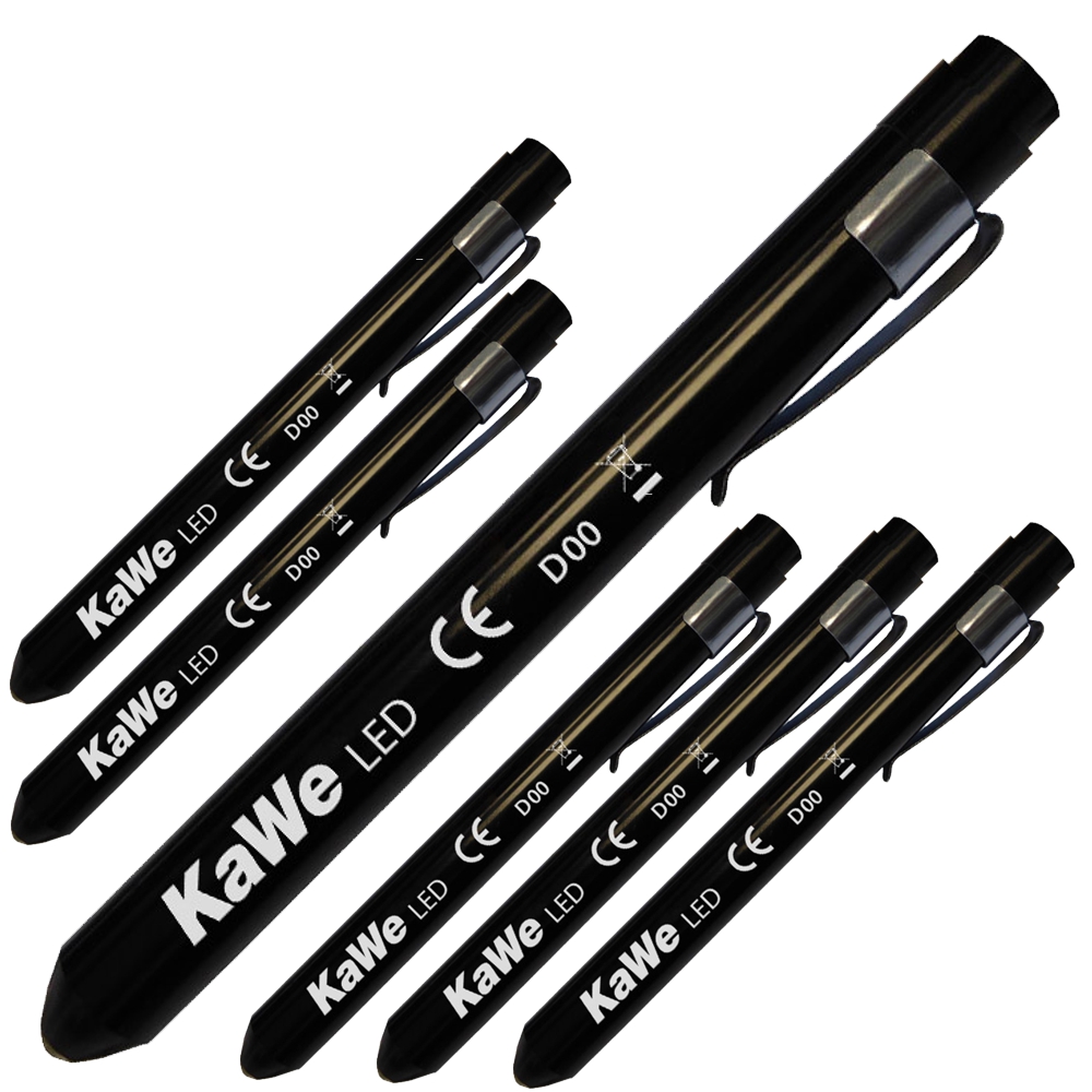 6er Set Diagnostikleuchte LED KAWE, Farbe schwarz, aus Metall, mit Druckknopf, gemäß IEC 62471 für Augenuntersuchungen geeignet, Länge 13,5 cm, inkl. auswechselbaren Batterien 1,5 V Micro (Typ AAA).