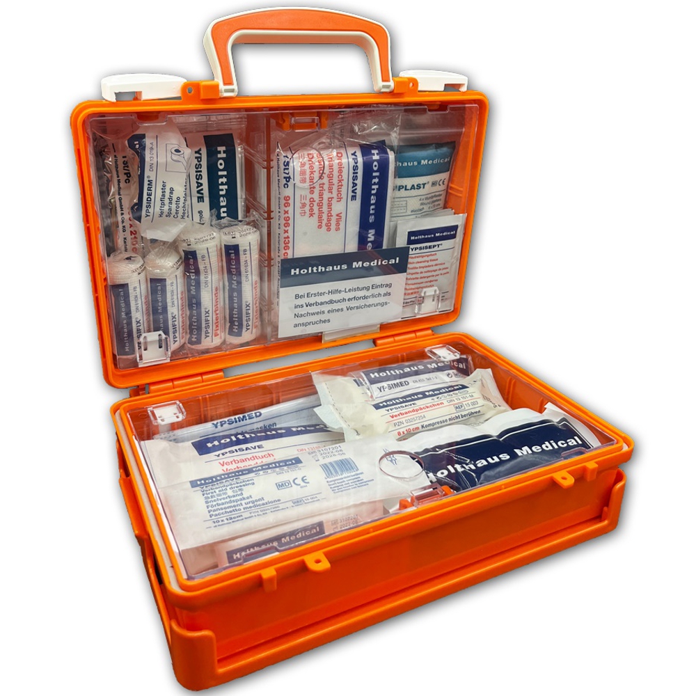 Erste Hilfe Koffer HOLTHAUS Quick mit DIN 13157. Aus hochschlagfestem ABS-Kunststoff mit umlaufender Gummidichtung, leichtgängige Drehverschlüsse und verstärkter Tragegriff, transparente Abdeckplatten zum Schutz der Füllteile variable Inneneinteilung durch die Trennstege, inklusive Wandhalterung mit 90°-Stop-Arretierung, plombierbar inklusive Montagematerial und nachleuchtendem Rettungszeichen.
